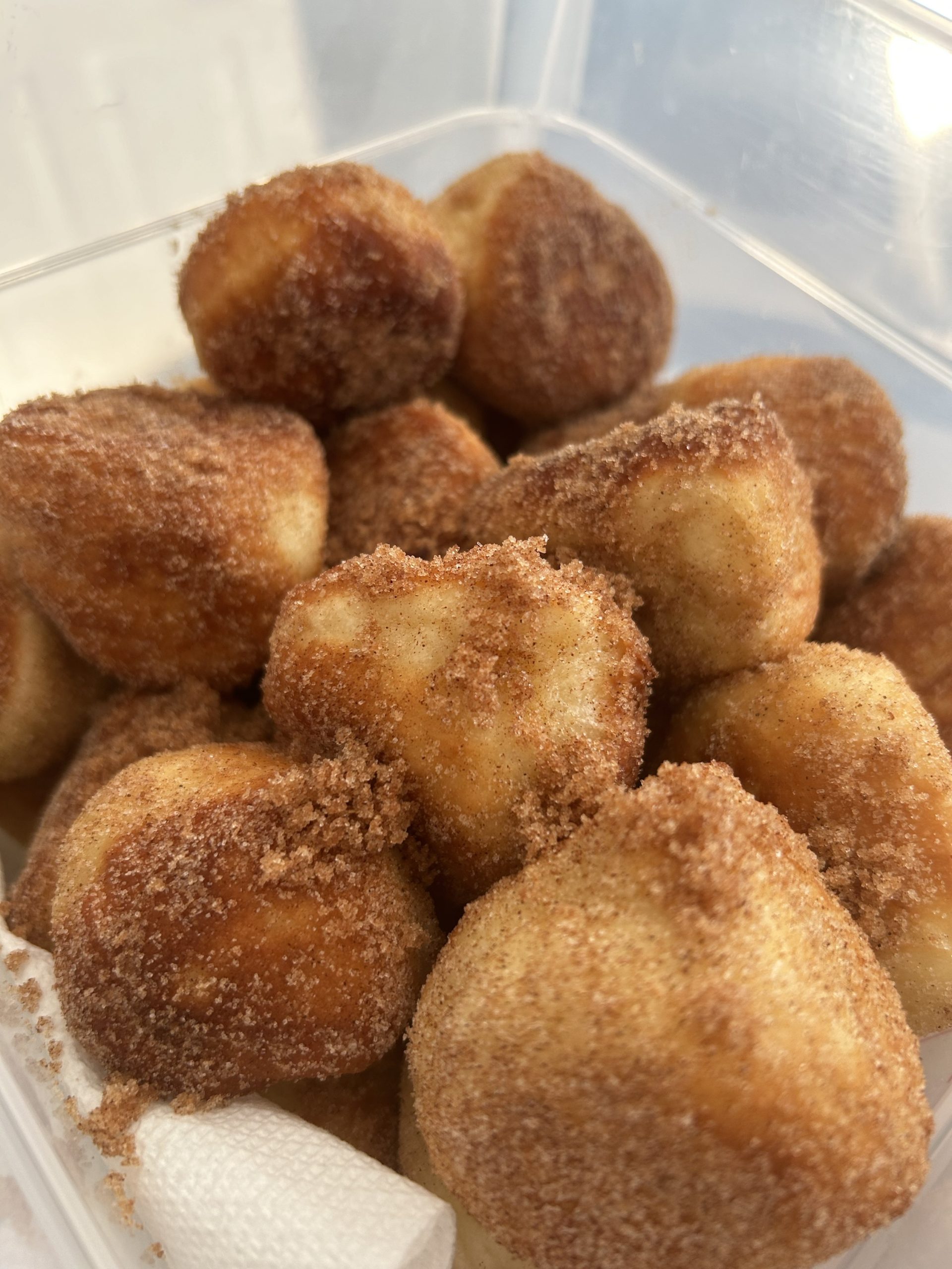 Donut holes made with both sourdough and yeast. Rolled in cinnamon sugar